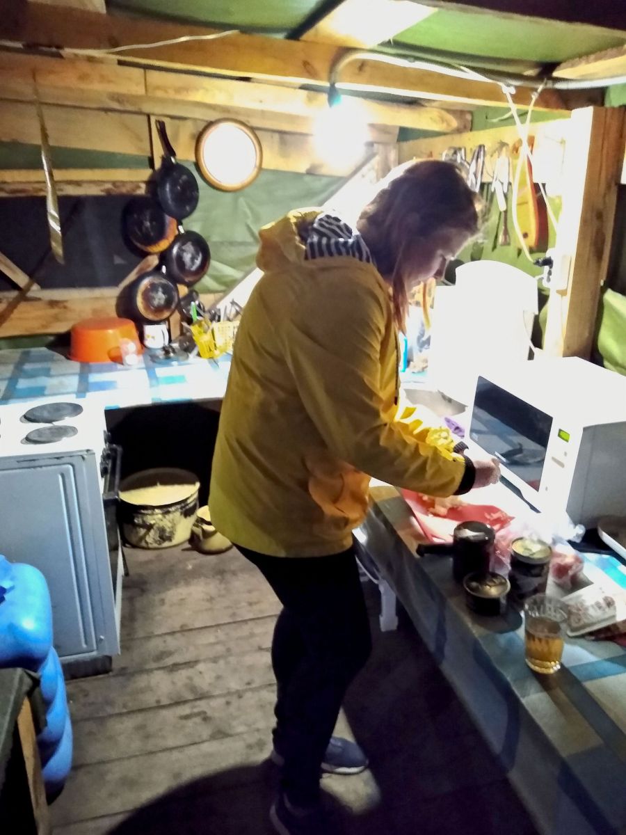 Der Bus fährt jeden nach Hause auf der Insel, das ist ziemlich praktisch. So wurden wir direkt vor unserer Unterkunft abgeladen. Wir haben ein Zelt auf einem Campingplatz gebucht, als wir ankamen hat uns der Besitzer gesagt es sei doch zu kalt für ein Zelt und das wir in einen Holzraum gehen können für denselben Preis. Wir waren schlussendlich froh haben wir das so vereinbaren können, den auf der Insel war es plötzlich viel kälter als in Listvyanka.